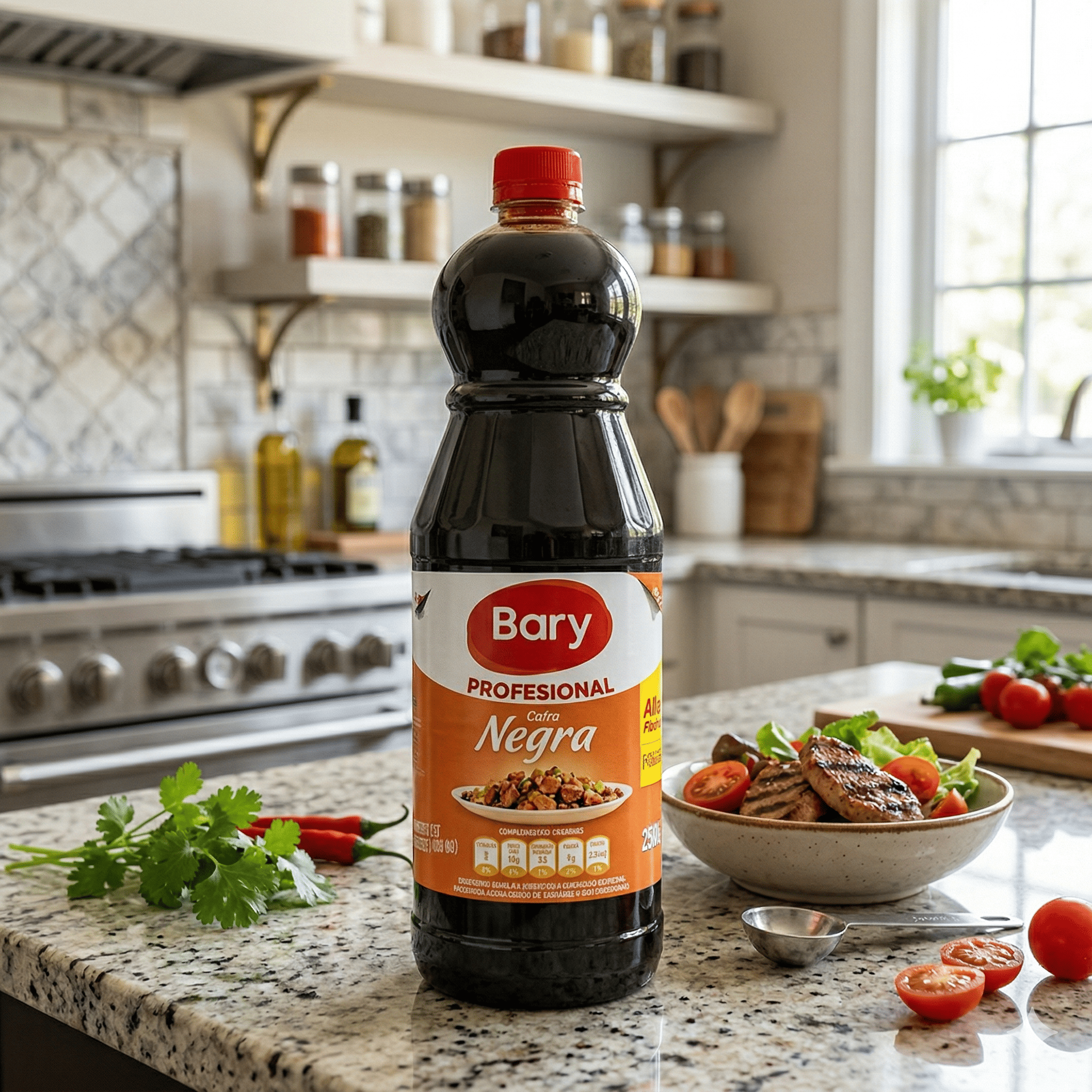 Salsa negra para sazonar carnes y preparaciones culinarias